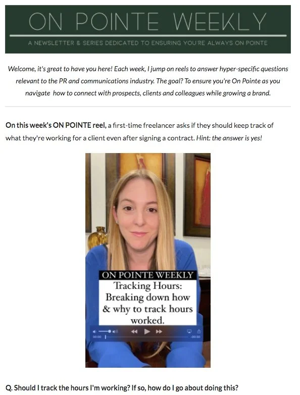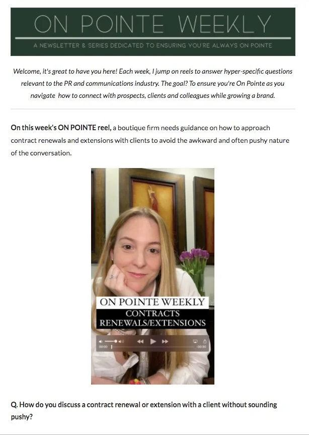 SUBSCRIBE TO THE ON POINTE NEWSLETTER A weekly newsletter and Q&A series to keep you On Pointe on your PR journey. First Name Last Name Email Address SUBSCRIBE Thanks for subscribing to our newsletter. Stay tuned and On Pointe every Wednesday!xx, Cristy How to: Develop a Proposal READ MORE Top Mistakes Companies in Trouble are Making READ MORE The Basics of Contract Renewals & Extensions READ MORE Managing Workload READ MORE How to: Get Press READ MORE Knowing Your Worth: How, What & Why to Track the Hours You Work READ MORE